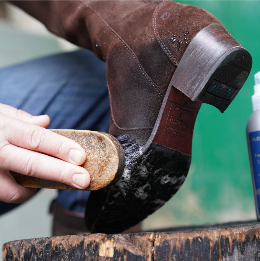 Then apply Dubarry Footwear Cleaner all over, including any fabric sections, and work-in, brushing vigorously until it lathers.